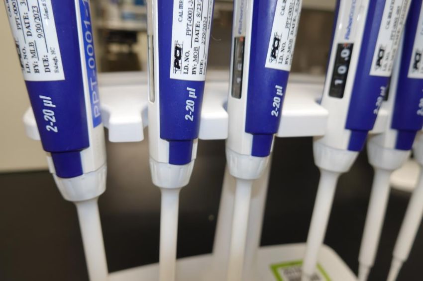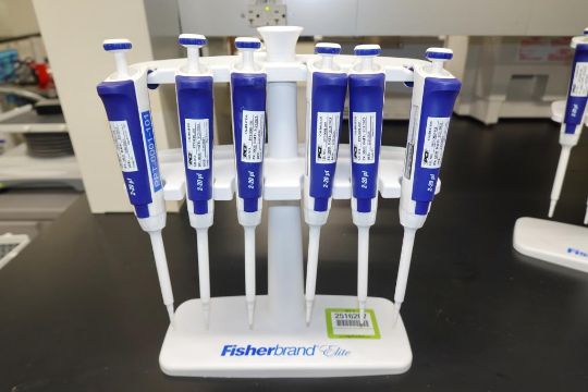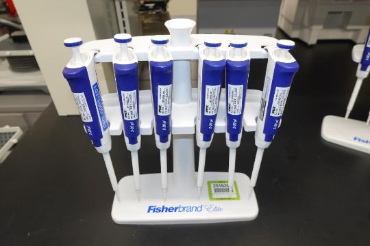 Fisherbrand Elite (Lot of 6) 2-20µL Single Channel Pipette With Holder Stand. Asset# 230211. HIT# 2516207. Main Lab. Asset Located at 112 S Duke St., Durham, NC 27701.