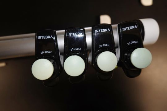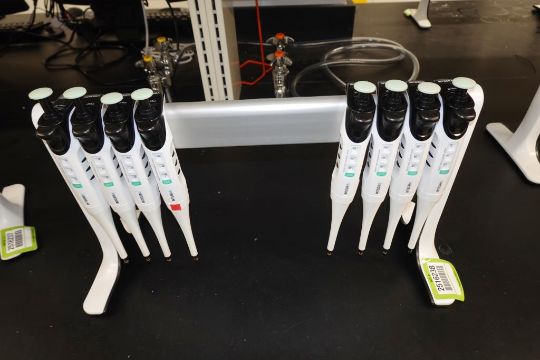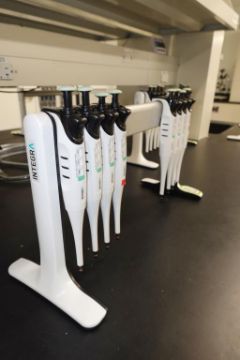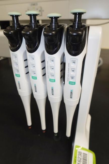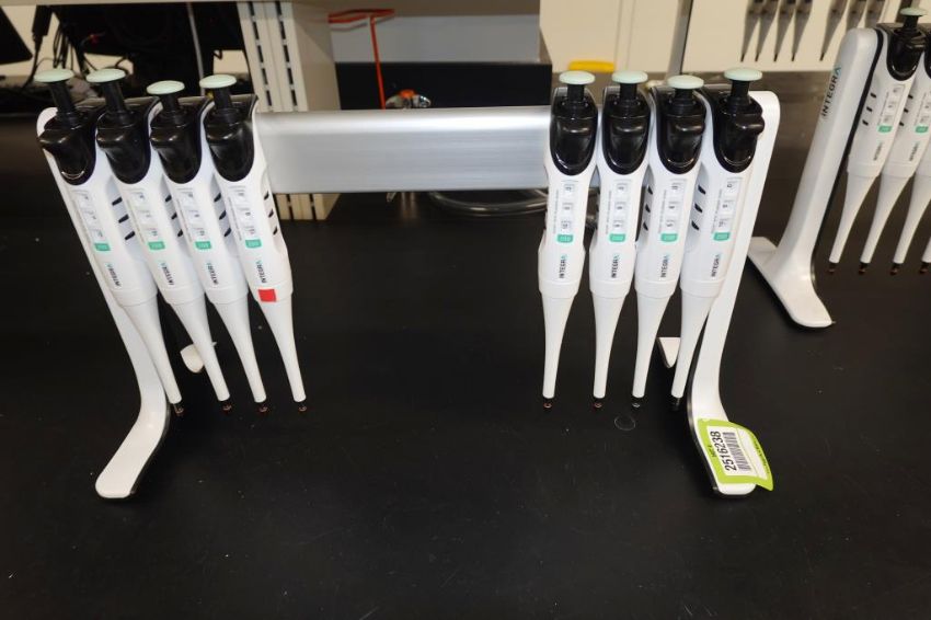 Integra Evolve (Lot of 8) Single Channel Pipettes, 20-200µL With Holder Stand. HIT# 2516238. Main Lab. Asset Located at 112 S Duke St., Durham, NC 27701.