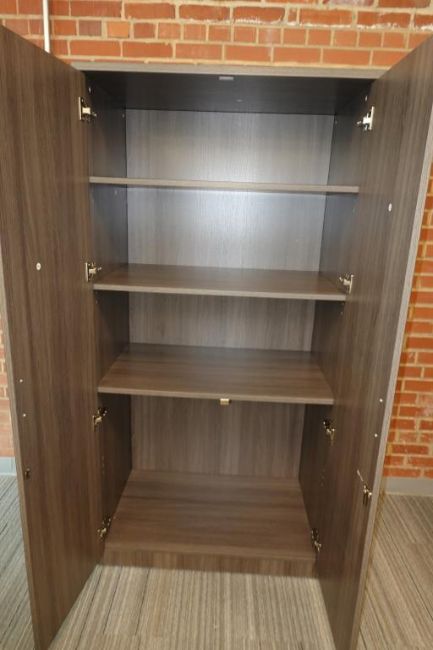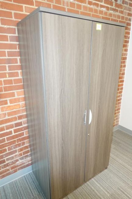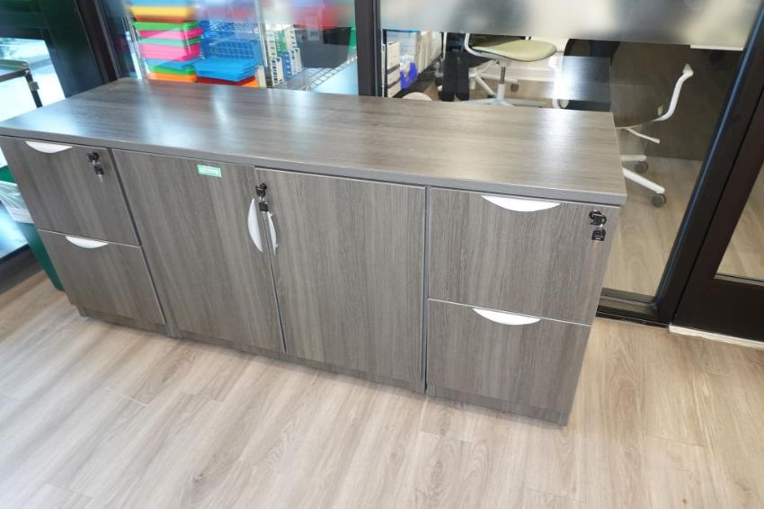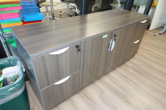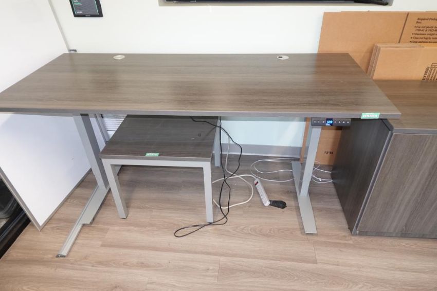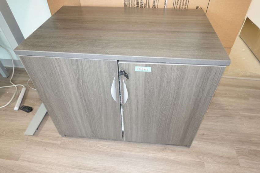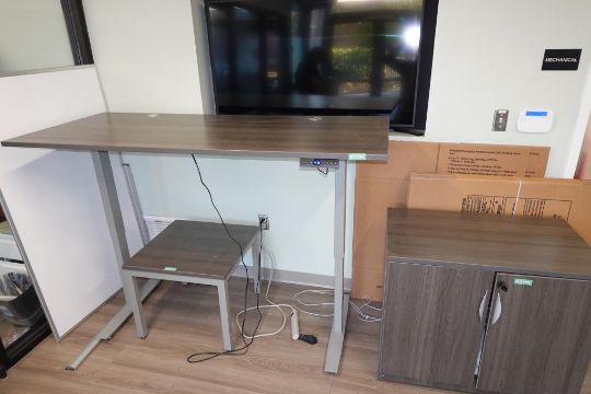 ULINE (1-Lot) Sit-Stand Desk Furniture Suite To Include (Qty 1) Sit-Stand Desk 6' ft. x 30" w x 48" H. Max, (Qty 3) 2-Door Office Supply Storage Cabinets, (Two Full Height & One 1/3 Height Sizes & (Qty 1) 68" in. x 22" in Credenza Cabinet. Includes Small Matching Table. HIT# 2509755. Main Bldg. Entrance, Bldg. 7 (1) Cabinet. Asset Located at 112 S Duke St., Durham, NC 27701.