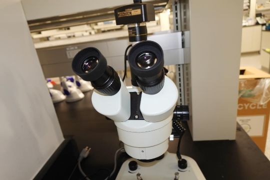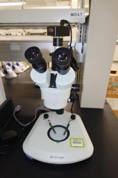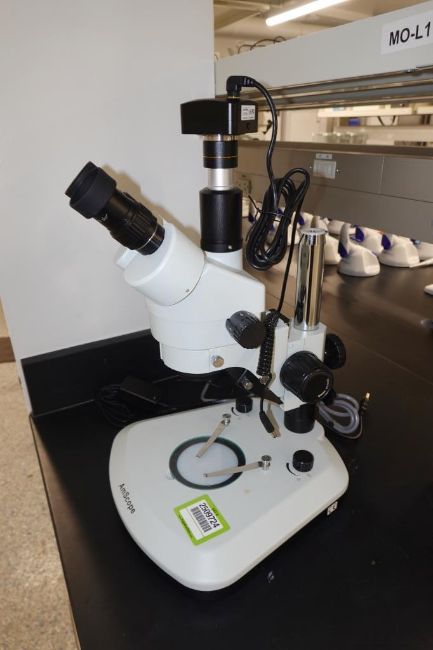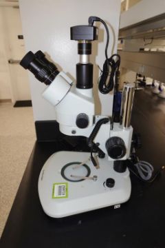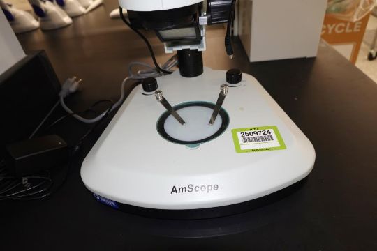 Amscope Stereozoom Microscope, (0.7- 4.5) With Digital Microscope Camera, Base Light Source, (Qty 2) Eyepieces. Asset# 230883. HIT# 2509724. Asset Located at 112 S Duke St., Durham, NC 27701.