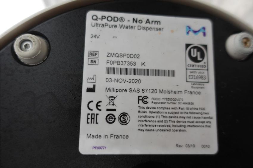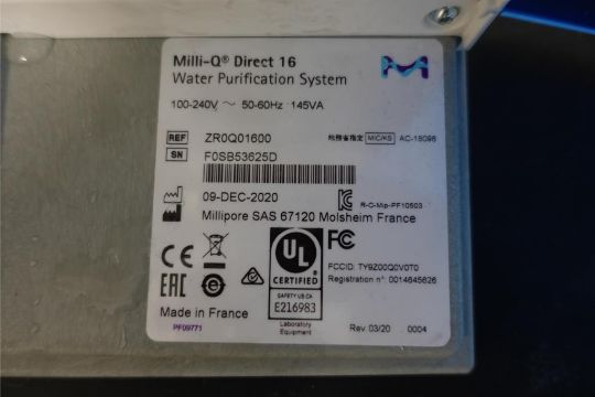 Millipore Milli-Q Direct 16 Water Purification System, Flow Rate: 16 Liters per hour, Product Water Volume: 320L/day, 100-240 v, 50-60 Hz w/ (1) Millipore m# Q-POD Ultrapure Water Dispenser, S/N F0PB37353K. SN# F0SB53625D. Asset# 230119. HIT# 2516042. Asset Located at 112 S Duke St. STE 1B, Durham, NC 27701.