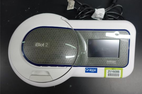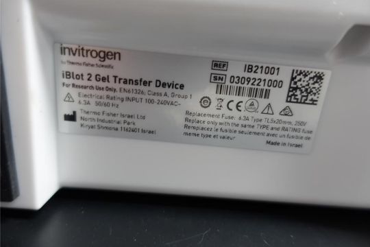 Thermo Scientific Invitrogen iBlot 2 Gel Transfer Device, 240 v, 60 Hz, 6.3 AMPS. SN# 309221000. Asset# 230588. HIT# 2516086. Asset Located at 112 S Duke St. STE 1B, Durham, NC 27701.