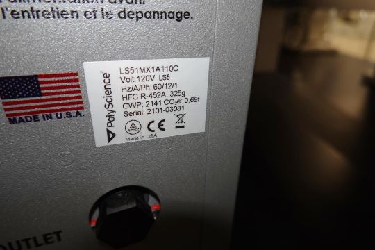 PolyScience LS5 1MX1A110C LM Series Benchtop Chiller With Turbine Pump. Working Temperature Range °C: -20° to 40°, Temperature Stability °C: ±0.1°. Reservoir Capacity (Gallons) 0.7, Reservoir Capacity (Liters) 2.65, LED Display Controls. SN# 2101-03081. Asset# 230055. HIT# 2509684. Asset Located at 112 S Duke St., Durham, NC 27701.