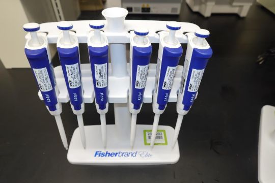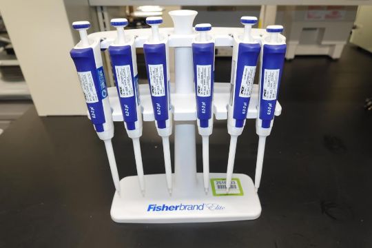 Fisherbrand Elite (Lot of 6) 0.2-2µL Single Channel Pipettes With Holder Rack. Asset# 230374. HIT# 2516203. Main Lab. Asset Located at 112 S Duke St., Durham, NC 27701.
