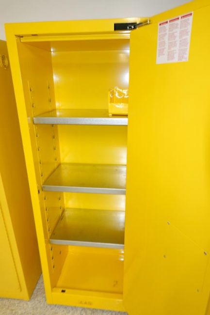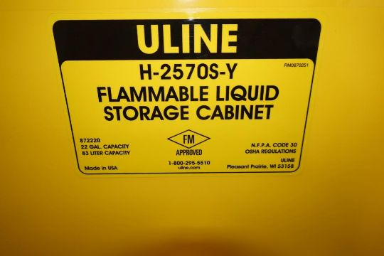 Uline H-2570S-Y Flammable Liquids Storage Cabinet, 22-Gallon/ 83-Liter Capacity. SN# 872220 & 29002. Asset# 230184. HIT# 2509695. Asset Located at 112 S Duke St., Durham, NC 27701.