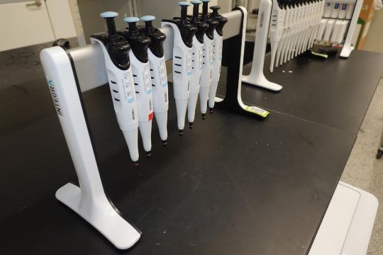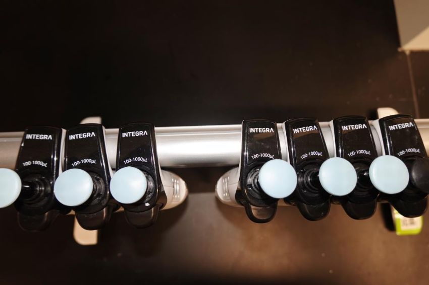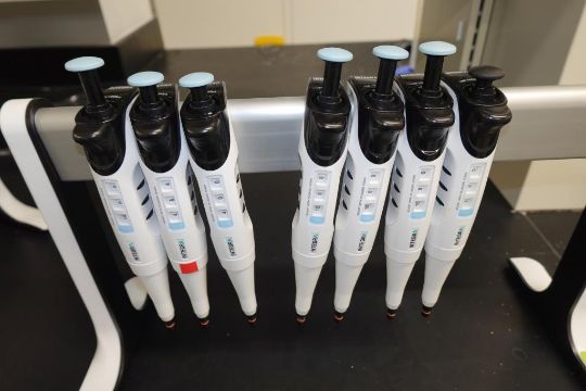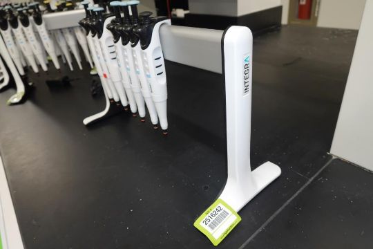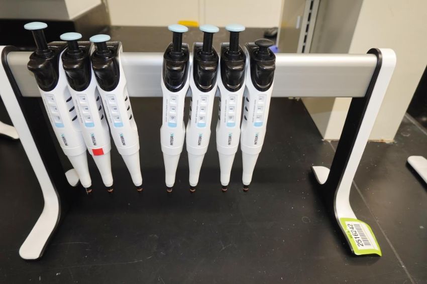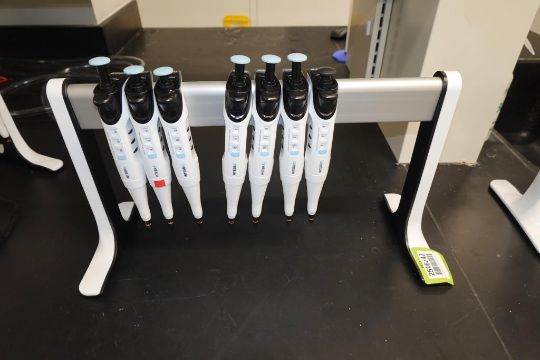 Integra Evolve (Lot of 7) Single Channel Pipettes, 100-1000µL With Holder Stand. HIT# 2516242. Main Lab. Asset Located at 112 S Duke St., Durham, NC 27701.