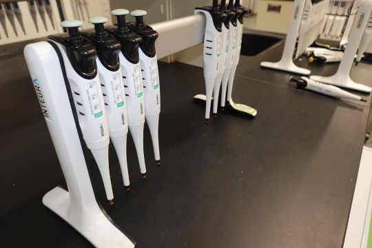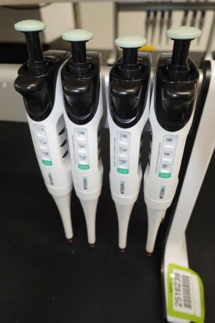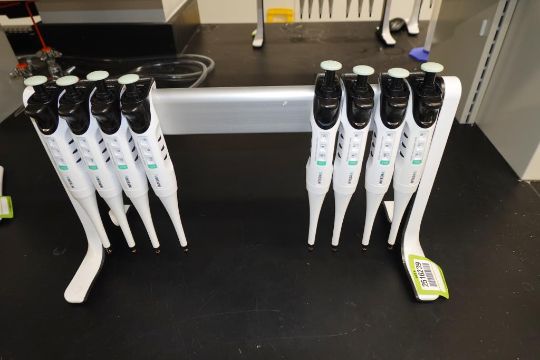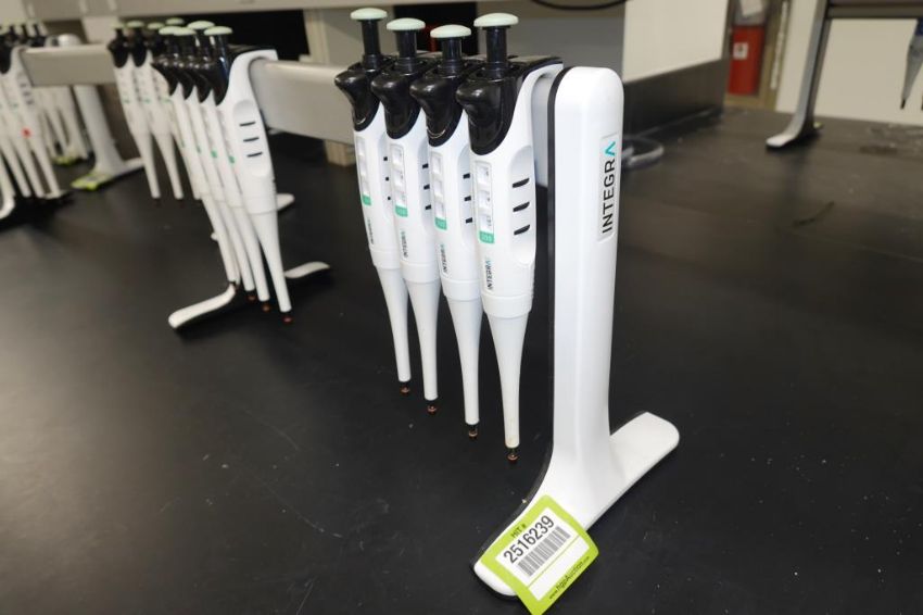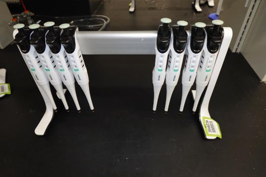 Integra Evolve (Lot of 8) Single Channel Pipettes, 20-200µL With Holder Stand. HIT# 2516239. Main Lab. Asset Located at 112 S Duke St., Durham, NC 27701.