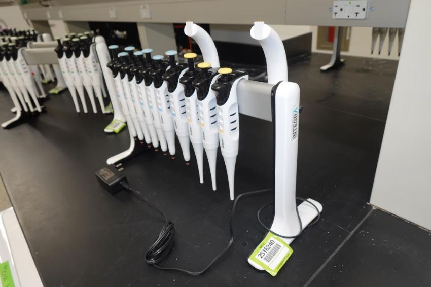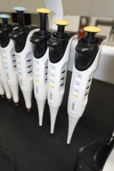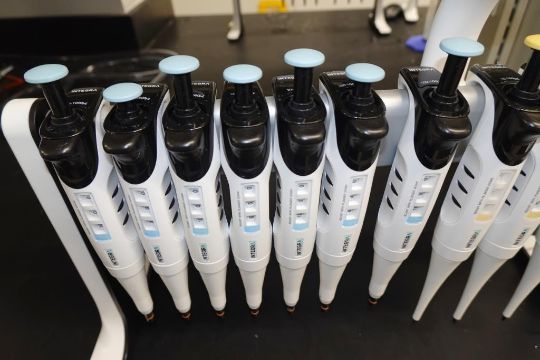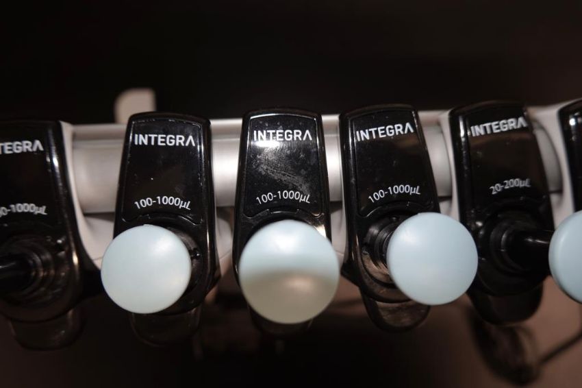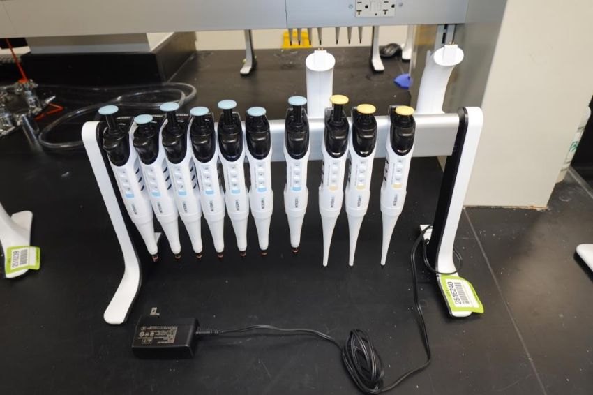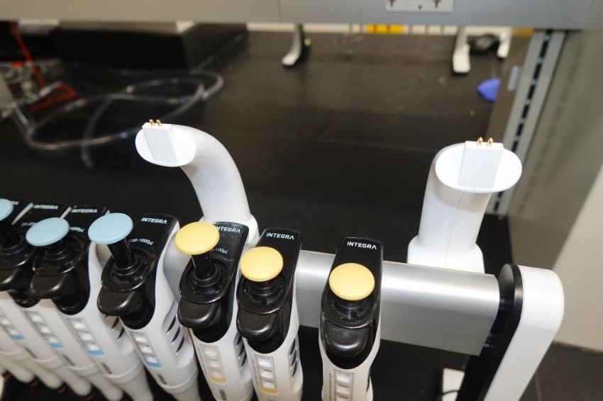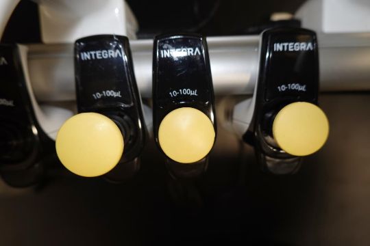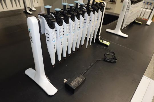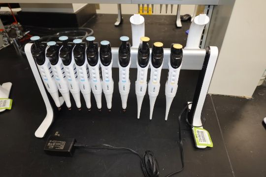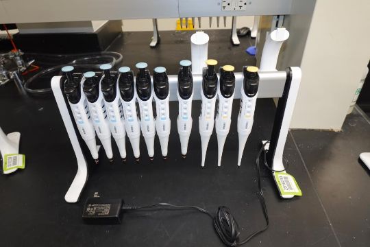 Integra Evolve (Lot of 10) Single Channel Pipettes To Include (Qty 7) 100-1000µL, (Qty 3) 10-100µL With Holder Stand. HIT# 2516240. Main Lab. Asset Located at 112 S Duke St., Durham, NC 27701.