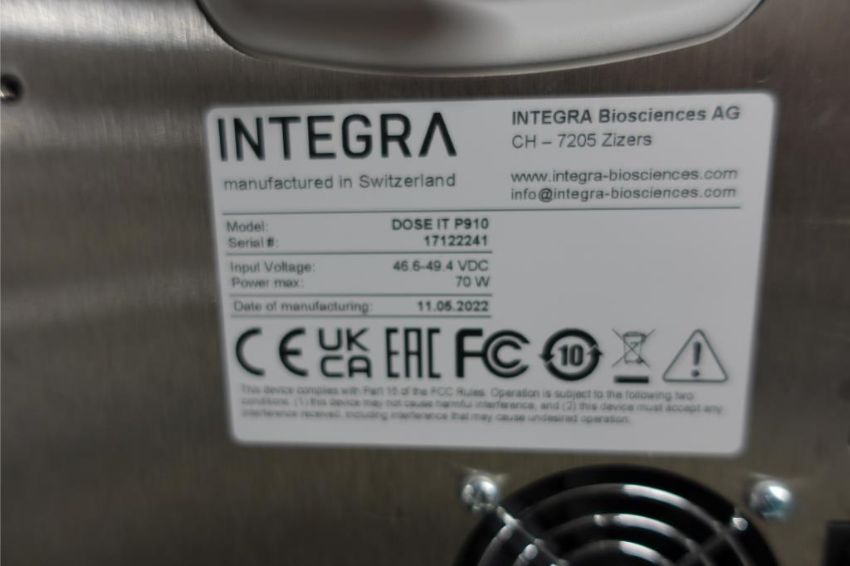 Integra DOSE IT P910 Peristaltic Laboratory Pump, 240 v, 60 Hz, Dose Volume: 0.1 ml - 9999 ml, Flow Rate: 0.6 ml/min - 5 l/min. SN# 17122241. Asset# 230447. HIT# 2516104. Asset Located at 112 S Duke St. STE 1B, Durham, NC 27701.