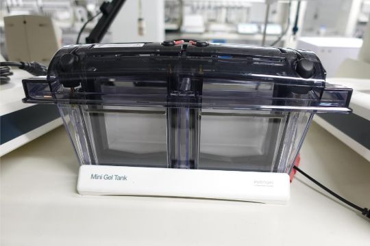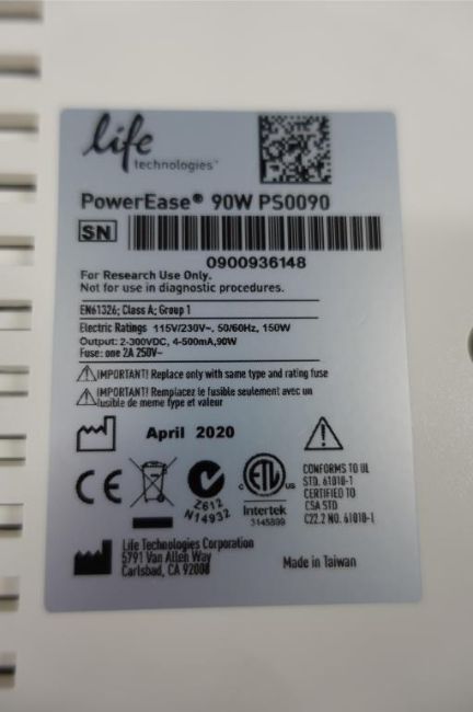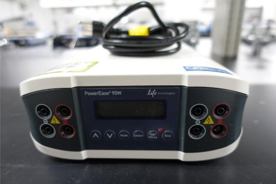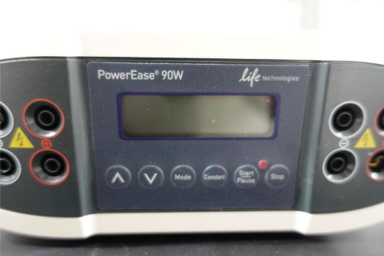 Life Technologies PowerEase 90W Gel Electrophoresis Power Supply, 115 v, 60 Hz w/ (1) Invitrogen Mini Gel Tank, 2 Gel Per Run Capacity. SN# 900936148. Asset# 230537. HIT# 2516087. Asset Located at 112 S Duke St. STE 1B, Durham, NC 27701.