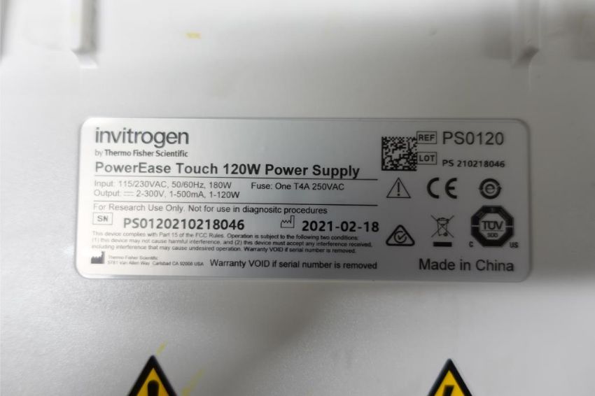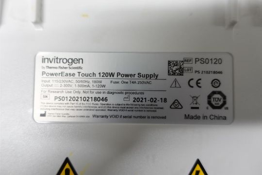 Invitrogen PowerEase Touch 120W Gel Electrophoresis Power Supply, 230 v, 60 Hz w/ (1) Invitrogen m# XCell4 Surelock Gel Electrophoresis System, 1-4 Gel Capacity. SN# PS0120210218046. Asset# 230426. HIT# 2516093. Asset Located at 112 S Duke St. STE 1B, Durham, NC 27701.