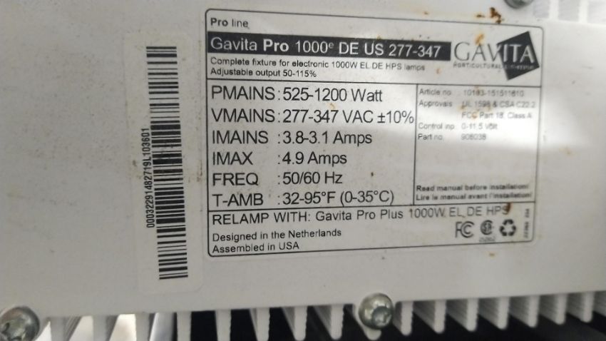 Lot Includes (approx. 630) Gavita HGC906748 & HGC906038 Proline Light Fixtures. Asset Located in East Syracuse, NY 13057.